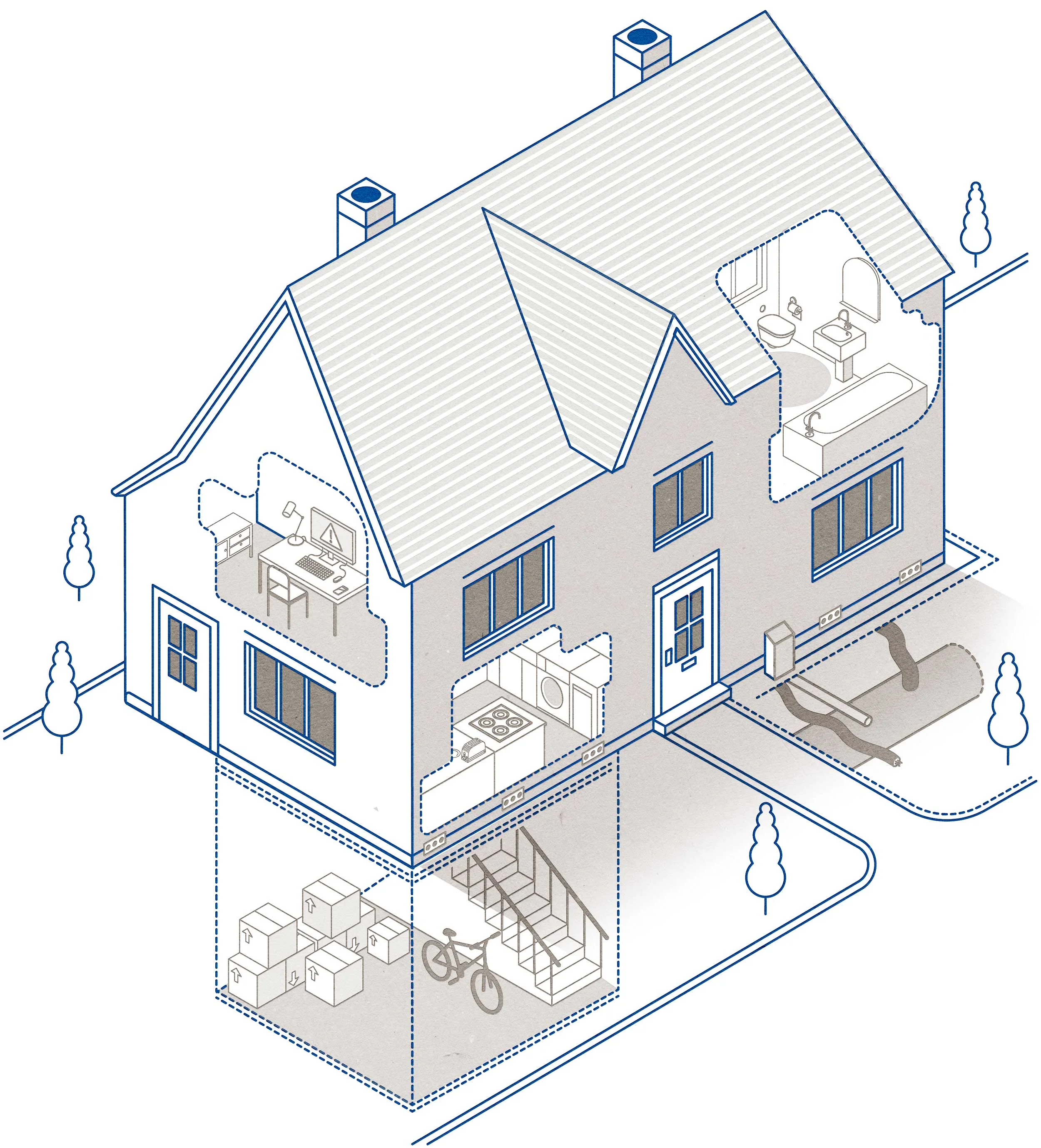A series of interactive isometric infographics created for Zurich Insurance Group, highlighting potential insurance problems with 1. Smart Technology. 2. Water Leaks. 3. Car Accidents 4. Fire Risks 5. Water Ingress.